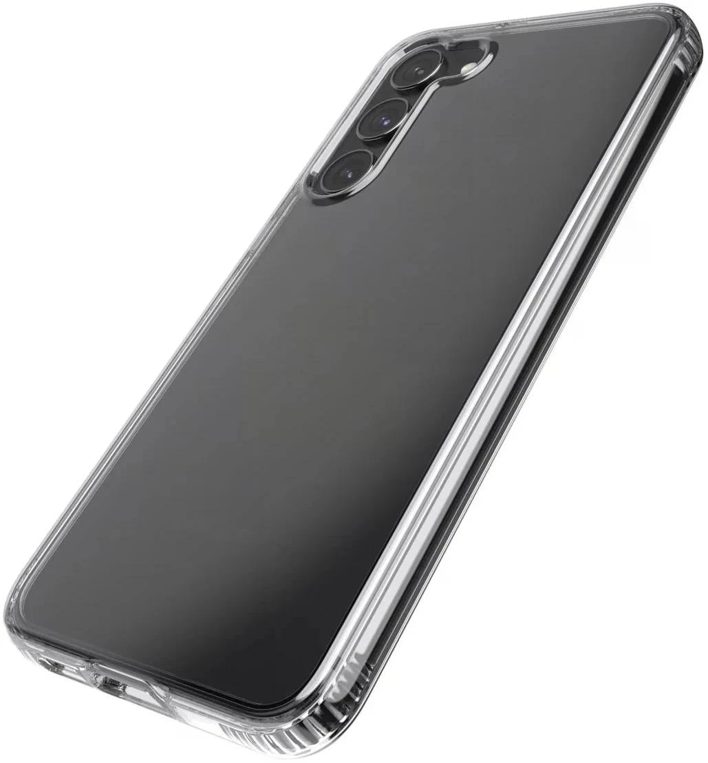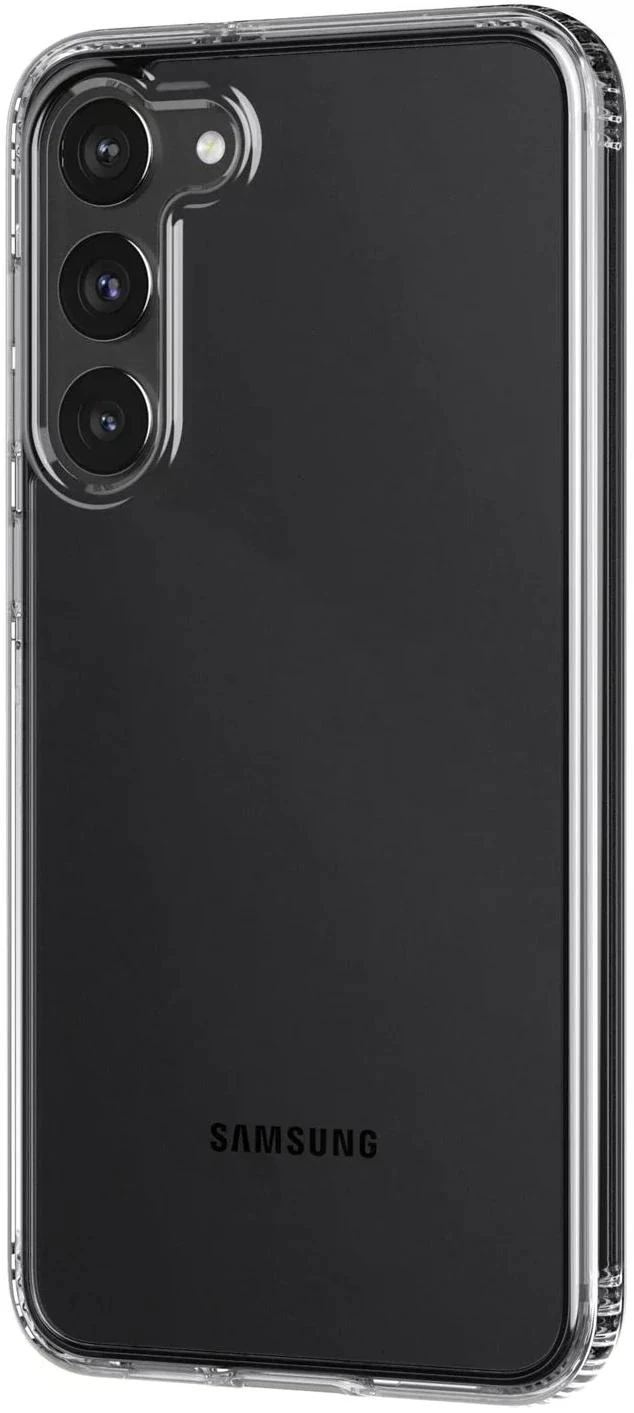 Das Evo Clear für das Samsung S23+ verfügt über UV-Schutzeigenschaften, ist kratzfest und hält Stürzen aus 3,6 m Höhe stand.